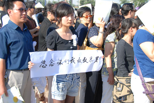 一名看起來80后的小姑娘手拿著橫幅“羅京叔叔我們懷念您”吸引大批媒體的目光,穿著牛仔短褲的她,低聲不語,站在原地?cái)?shù)分鐘,仍由拍照。