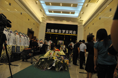 靈堂內(nèi)布置一新,羅京安靜的躺在棺木中央,身蓋黨旗,周身鮮花簇擁。一身深色西服配彩色領(lǐng)帶,面色白皙自然,與平日在主播臺上見到的“冷面”相比,多一絲溫暖。