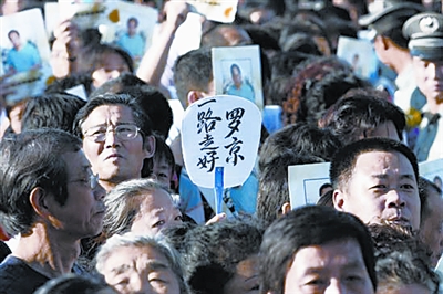 清晨開始,來(lái)自各方的群眾自發(fā)前往八寶山悼念羅京,長(zhǎng)達(dá)百米的隊(duì)伍蜿蜒而至公墓大門之外,數(shù)百只花圈擺滿靈堂兩側(cè),寄托著各方人士對(duì)羅京的緬懷之情。有白發(fā)蒼蒼步履蹣跚的80歲老人,有在父母帶領(lǐng)下、牙牙學(xué)語(yǔ)的孩子,有從小與羅京一起學(xué)習(xí)的同學(xué),有羅京高中母校的代表,有曾經(jīng)受過(guò)他指導(dǎo)的實(shí)習(xí)生,還有專程從美國(guó)趕來(lái)送羅京最后一程的校友,很多人憶起與羅京生前的點(diǎn)滴黯然淚下。近萬(wàn)人的哀悼隊(duì)伍井然有序,大家手持白菊,每七人一組向羅京遺體三鞠躬,為“國(guó)嘴”祈禱送行。