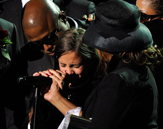 杰克遜在最后一刻上臺(tái)致詞,哥哥講到最后不能自控掩面痛哭,緊緊擁抱身邊的妹妹珍妮.杰克遜等家人,杰克遜的大女兒說:“從我出生以來他是我最好的父親,我只想說我愛你!“場面感人,催人淚下。