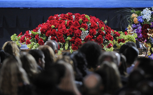 至此,追思會(huì)完美落幕,靜躺在舞臺(tái)中央的杰克遜靈柩,被鮮花簇?fù)碇,靜靜抬離現(xiàn)場,出現(xiàn)在大幕上的鏡頭是這位天王最后一次的彩排畫面,深色褲子與西服,紅色襯衣,動(dòng)作嫻熟而精湛,風(fēng)采絲毫不減當(dāng)年,斯人如舊。