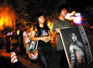昨晚,歌迷手持邁克爾·杰克遜的照片繞后海行走,悼念這位樂壇巨星。美國流行樂壇巨星邁克爾·杰克遜25日因心臟病發(fā)作在洛杉磯一家醫(yī)院不治身亡,終年50歲。為確認(rèn)杰克遜的死因,洛杉磯驗(yàn)尸官今日將進(jìn)行尸檢。