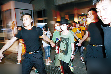 7月11日晚上7時,阿嬌抵達哈爾濱參加嘉年華活動。她出機場時頭戴禮帽,面戴口罩,二十多名貼身保鏢護駕。她身穿一件印有墨色男人頭像的大T恤,無獨有偶,陳冠希7月10日在香港出席陸永“棟篤笑”演出拜神儀式時,也穿著同款式T恤———這對舊情人真是心有靈犀!