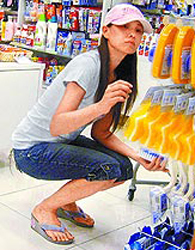 她昨天脂粉未施逛賣場,還直接蹲在地上,先買1瓶天然養(yǎng)生醋,又買入浴劑,逛到開架式化妝品,又買了唇蜜及眼影。
