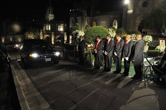 就如同邁克爾的人生一樣令人無法猜測,邁克爾連自己的喪禮都遲到了。喪禮原定當(dāng)?shù)貢r間晚上7時舉行。但邁克爾雙親及部份家人,乘坐著由六輛勞斯萊開道的30多輛車隊,遲至晚間8時10分才抵達(dá)。運(yùn)送他鍍金靈柩的靈車,更是晚了90分鐘才被送到哀悼者的面前。