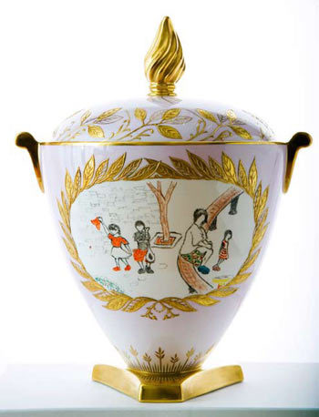 李亞鵬在2009年度嫣然天使基金慈善晚宴新聞發(fā)布會上表示,晚宴現(xiàn)場拍賣所需的藝術(shù)品已基本到位。其中,最吸引眼球的拍品無疑就是由兩位“潛力藝術(shù)家”竇靖童、李嫣聯(lián)手設(shè)計的Wedgwood-Trophy Vase(瑋致活—勝利之瓶)精致骨瓷。據(jù)悉,Wedgwood是英國傳統(tǒng)陶器品牌,竇靖童、李嫣為Trophy Vase所創(chuàng)作的這一設(shè)計,取材于一家人融洽相處的畫面,表現(xiàn)出小孩眼中的溫馨家庭氛圍和每個人都渴望得到的關(guān)愛。