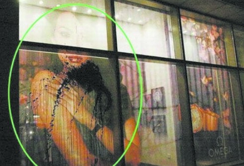 張曼玉沒(méi)來(lái),章子怡也只是外出吃飯。正當(dāng)記者們準(zhǔn)備收工時(shí),又一件意外的事情發(fā)生了。23點(diǎn),一輛黑色奧迪Q 7在酒店門(mén)口停了下來(lái),隨后四五個(gè)身穿迷彩服、戴著墨鏡的男子從車(chē)?yán)镒呦聛?lái)進(jìn)入酒店大堂詢(xún)問(wèn)保安:“章子怡住幾層?”看到保安未予理會(huì),這幾個(gè)人立刻站在酒店大堂內(nèi),用東北話(huà)高喊:“大傻X!騙人錢(qián)!勾引人老公!”而大約半小時(shí)后,這輛車(chē)又回到了酒店門(mén)前。這次車(chē)上下來(lái)兩個(gè)身穿套頭衫的男子,手里拿著墨汁,走到酒店?yáng)|側(cè)一間章子怡代言的鉑金店門(mén)前,沖櫥窗里的章子怡海報(bào)將墨汁潑了上去(見(jiàn)上圖)。隨后,兩人上車(chē),Q 7拉著警報(bào)揚(yáng)長(zhǎng)而去。