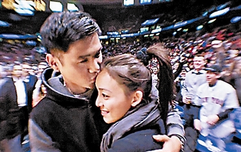 黑人說,易建聯(lián)建議他要在中場時間求婚,當(dāng)時場內(nèi)的老外球迷也充當(dāng)“助攻員”,不斷鼓掌起哄,讓范范最后點頭同意嫁他。他很愛籃球,求婚當(dāng)天又是籃球巨星喬丹的生日,如今又求婚成功,意義重大,加上范范應(yīng)邀在NBA球賽開幕時演唱美國國歌,此行“成果豐碩”。