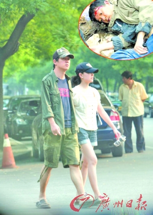 為了不讓外人認(rèn)出,潘粵明與董潔都將帽檐壓得很低,兩人十分悠閑地邊走邊聊。從行走狀態(tài)上看,潘粵明已能行走自如,只是步履比較緩慢,董潔顯得比較緊張,還不時(shí)看看潘粵明臉上是否有不適的感覺。當(dāng)天董潔的左手中握著一卷褐色的物品,很像是醫(yī)用繃帶之類的東西,看樣子是為潘粵明準(zhǔn)備的。