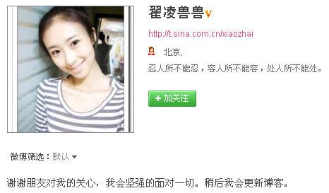 翟凌在微博中寫道:“謝謝朋友對(duì)我的關(guān)心,我會(huì)堅(jiān)強(qiáng)的面對(duì)一切。稍后我會(huì)更新博客!