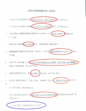 在清單里能看到的部分內(nèi)容包括,“現(xiàn)場嘉賓桌擺放贊助飲料娃哈哈飲用水、蒙牛牛乳飲料,給予鏡頭展示”;“互動主持臺立面設(shè)計上體現(xiàn)‘中國平安·平安中國’字樣,給予鏡頭展示”;“春晚工作人員穿著喬丹贊助的服裝,春晚現(xiàn)場給予鏡頭展示”;“佳能相機作為道具出現(xiàn)在歌舞《拍拍拍》節(jié)目中,相機及相機掛帶上的logo在鏡頭中出現(xiàn)”;“小品節(jié)目《50塊錢》中,魯花食用油在面案或小桌上擺放,貼有企業(yè)Logo的圍裙作為道具由演員使用,給予鏡頭展現(xiàn)”;“劉謙近景魔術(shù)節(jié)目中,使用匯源果汁作為道具,給予鏡頭展示”;“趙本山演出的小品節(jié)目中帶有企業(yè)的logo的瀘州老窖禮盒作為道具由演員使用,給予鏡頭展示!