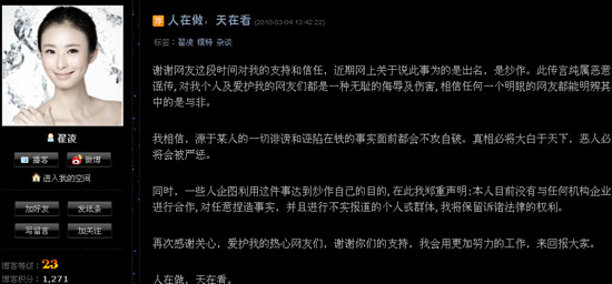 2月25日,“獸獸”翟凌利用博客發(fā)表聲明,就“艷照門”事件及相關(guān)不雅視頻在網(wǎng)絡(luò)上瘋傳一事進(jìn)行公開表態(tài)。