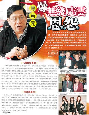 多年來,蕭若元一直不滿無線的壟斷行為。對(duì)于陳志云涉貪事件,他有感而發(fā):“我認(rèn)識(shí)他多年,但和他不熟。我很欣賞他的聰明,EQ又高,可惜他聰明有余,智慧不足!标愔驹艵Q高眾人皆知,去年蕭若元召集了20多人在書展上攻擊他,無論別人怎么高喊口號(hào),陳志云仍能鎮(zhèn)定微笑。但蕭若元指出:“陳志云太過濫權(quán)、偏心,作為一個(gè)大機(jī)構(gòu)的高層,他不應(yīng)該過分高調(diào),也不該和下屬太過親密,那樣會(huì)很麻煩。蕭定一就是一個(gè)例子,他當(dāng)年和李彩樺拍拖,就被人指偏心!