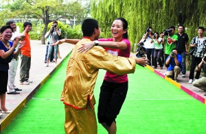 昨天下午,章子怡作為特奧全球形象大使現(xiàn)身北京通州培智學(xué)校,和近百名智障學(xué)生一起玩融合滾球和足球。在比賽中取得勝利的章子怡興奮地和自己的搭檔——一位智障男孩擁抱在一起。