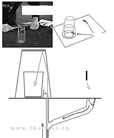 網(wǎng)友分析:在這個(gè)魔術(shù)中,我們可以注意到,大杯與小杯中間仍有縫隙,大杯是倒著放的,小杯則是正立著套在大杯里的。黑色的桌布主要是為了掩飾從桌下彈射硬幣的出口。在表演時(shí),劉謙攥著硬幣的手曾一直放在桌子的左下角,其實(shí)那里正是硬幣進(jìn)入的地方。經(jīng)過桌下的機(jī)關(guān),硬幣順勢(shì)滑到杯子下方。觀眾們看到的是硬幣從小杯子與大杯子間的桌面射進(jìn)大杯然后被大杯壁和大杯底2次反彈后落入小杯中的。經(jīng)推斷,劉謙應(yīng)該還在桌子某個(gè)位置布置了一個(gè)彈射硬幣的機(jī)關(guān),從而讓硬幣從桌布下面射出來。