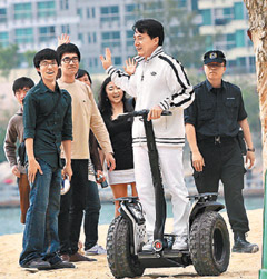 成龍忙拍電影、忙公益慈善,環(huán)保也是他重視的課題,由他代理的塞格威(SEGWAY)單人雙輪電動滑板車,將成為圣淘沙主要代步工具,昨天成龍抵達到新加坡推廣這活動,目前圣淘沙引進50臺,并計劃在兩年內(nèi)增加至200臺,讓旅客隨意往來島上各景點。