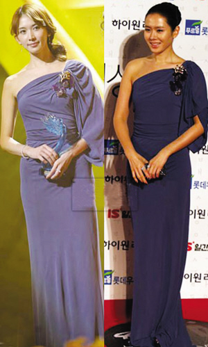 上周五(2月27日)韓國(guó)百想頒獎(jiǎng)典禮,孫藝珍穿長(zhǎng)款紫色禮服出場(chǎng);而在隔天(28日)的2009上海新娛樂慈善群星會(huì)上,林志玲竟穿一模一樣的禮服登場(chǎng)。撞衫常見,而撞得時(shí)間如此緊密,實(shí)在有趣。