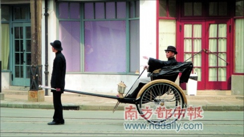 前天,《建國(guó)大業(yè)》的拍攝場(chǎng)地就在車墩影視基地的“南京路”,既然拍的是上海戲,當(dāng)時(shí)上海灘的大佬杜月笙就自然成了重要人物。昨天,馮小剛的“任務(wù)”就是坐在黃包車上,后面跟著一幫人馬,在“南京路”上拉風(fēng)地走過(guò)去。馮小剛戴著帽子,鼻梁上架著圓圓的老式墨鏡,拎著一個(gè)拐棍,他的黃包車,也被做成了鍍金的。黃包車后面,跟著20多個(gè)黑衣保鏢,派頭十足。這個(gè)造型,讓人不免想起了《功夫》中馮小剛客串的鱷魚(yú)幫老大。