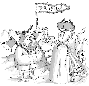在這一點上,“山寨造”與“大話體”有明顯的差別。山寨反貪官不反皇帝,一心模仿偶像、保護偶像,折騰得再生猛,也還是依附于偶像。山寨人物或產(chǎn)品也毫不掩飾模仿過程中笨拙的身姿,甚至大有把笨拙風(fēng)格化、勵志化的勁頭。茶余飯后觀賞一番,沒有精神壓力,也還算得上一個玩意兒。而“大話體”雖然同樣是以模仿為主要特征,卻是“戲仿”,“仿”字前面的“戲”字才是其險惡用心,最終要瓦解偶像的神圣意義。當(dāng)然,這么說并不意味著“山寨造”和“大話體”沒有交叉,事實上,“山寨《新聞聯(lián)播》”就很有點兩家通吃的感覺。草根文化博大精深,只要加上那么一點點“文化自覺”的作料,一切皆有可能!