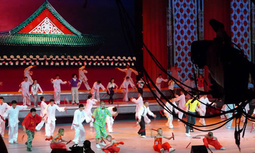 由河南少林塔溝武校表演的武術(shù)劇《功夫世家》,演員們不僅表演常規(guī)性的武術(shù),還有情節(jié)串聯(lián)其中,在昨日的彩排中備受好評。近20個不同年齡的演員組成一家人,手里拿著各種生活用品,拐杖、雞毛撣子等都被作為武器,每個人都能打上一段,中間還穿插了交誼舞、恰恰舞等元素,武術(shù)演員們搞笑的表演十分引人入勝,引得臺下觀眾大笑不止,雖然搞笑,但一看就知道是真功夫。節(jié)目的下半段,電視劇《李小龍傳奇》中李小龍的扮演者、香港演員陳國坤亮相,所有武術(shù)演員在陳國坤的帶領(lǐng)下,一起舞起了雙截棍,但因為陳國坤是首次參加春晚,所以顯得很緊張,動作十分不熟練,但隨后陳國坤漸漸找到了感覺,與演員的配合也默契了很多。整個節(jié)目的場面非常壯觀,氣勢逼人。與以往的武術(shù)節(jié)目相比,塔溝武校參加2009年央視春晚的節(jié)目在昨日的彩排中表現(xiàn)更加搶眼,使得在場的每一位觀眾都笑不籠嘴,甚至連鼓掌都忘記了,一直沉浸在詼諧、幽默的節(jié)目的氛圍之中。