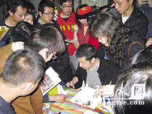 記者發(fā)現(xiàn)一位男青年手里抱著一堆書(shū),忙前忙后地見(jiàn)人就問(wèn),你是賈導(dǎo)的影迷嗎?他告訴記者,他叫徐鑫,是賈樟柯影迷聯(lián)盟的成員,在北京讀大學(xué)時(shí)就喜愛(ài)看賈導(dǎo)的電影,聯(lián)盟的成員委托他來(lái)南京幫著要簽名,“有陜西、山西,還有江蘇無(wú)錫、常州的,這些書(shū)是幫他們簽的! 徐鑫說(shuō),他此次來(lái)還有一個(gè)任務(wù),就是發(fā)展成員。“聯(lián)盟剛剛成立不久,只有七八十人,今天收獲不小,至少有40多人表示愿意加入。”記者問(wèn)他對(duì)現(xiàn)場(chǎng)火爆的情形怎么看,他認(rèn)為,不排除有些大學(xué)生根本就沒(méi)看過(guò)賈導(dǎo)的電影和書(shū),是來(lái)趕熱鬧的,把他當(dāng)成了偶像。