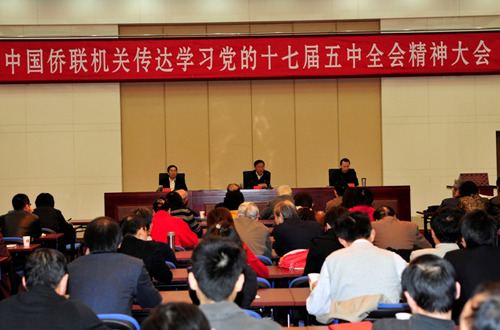 中新網(wǎng)10月20日電 據(jù)中國(guó)僑聯(lián)網(wǎng)消息,10月19日上午,中國(guó)僑聯(lián)機(jī)關(guān)召開(kāi)傳達(dá)學(xué)習(xí)黨的十七屆五中全會(huì)精神大會(huì)。中國(guó)僑聯(lián)在京顧問(wèn)、僑聯(lián)機(jī)關(guān)、直屬企事業(yè)單位、離退休全體黨員參加了會(huì)議。中國(guó)僑聯(lián)主席林軍介紹了參加十七屆五中全會(huì)的情況并傳達(dá)了中共中央總書記胡錦濤在全會(huì)上的兩次講話和國(guó)務(wù)院總理溫家寶就《中共中央關(guān)于制定國(guó)民經(jīng)濟(jì)和社會(huì)發(fā)展第十二個(gè)五年規(guī)劃的建議》所作的說(shuō)明。中國(guó)僑聯(lián)副主席董中原主持會(huì)議,副主席喬衛(wèi)出席會(huì)議。