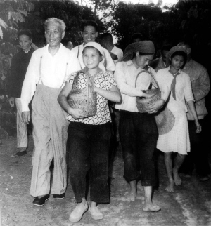畫面上,曾六妹(前方穿花格衣服者)和她的同學(xué)張桂嬌提著滿藍(lán)的咖啡果走在前面,兩人還不時(shí)交流勞動(dòng)心得,而劉少奇則像一位和藹的長者,慈祥地跟在她們身后。