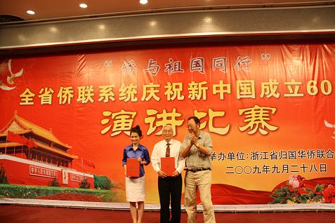 為慶祝新中國成立六十周年,浙江省僑聯(lián)于9月28日下午,在浙江圖書館二樓報(bào)告廳舉辦了以“僑與祖國同行”為主題的全省僑聯(lián)系統(tǒng)演講比賽活動(dòng),由各市僑聯(lián)推薦的、來自全省僑界各行各業(yè)的19名參賽選手參加了比賽活動(dòng)。