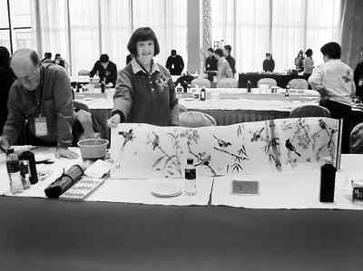 國(guó)際友人對(duì)筆會(huì)也是情有獨(dú)鐘。來自澳大利亞的博理查和宣月,已跟中國(guó)老師林伯墀學(xué)中國(guó)畫達(dá)10年之久。林老師讓宣月不但學(xué)中國(guó)畫,還要學(xué)更多的中國(guó)文化。她這次來想通過參與交流,開闊視野,取長(zhǎng)補(bǔ)短,使自己的繪畫藝術(shù)再上一層樓。她還高興地展示了自創(chuàng)的花鳥畫集,并和博理查向藝術(shù)節(jié)敬獻(xiàn)了現(xiàn)場(chǎng)創(chuàng)作的“鮮花綻放圖”和“袋鼠翹首觀望圖”。來自美國(guó)西雅圖的畫家,把自己創(chuàng)作的一幅長(zhǎng)達(dá)十幾米、影響類似中國(guó)《清明上河圖》的《西雅圖美景》大畫贈(zèng)給了華人文化藝術(shù)節(jié)組委會(huì),感動(dòng)了在場(chǎng)的海內(nèi)外僑胞。