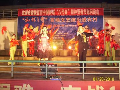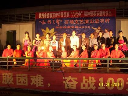 欽州市粵劇團共演出舞蹈、小品、獨唱等20多個節(jié)目,內(nèi)容豐富多彩,謳歌了欽州改革開放成就,有鮮明地方特色。觀看群眾達到3000多人。